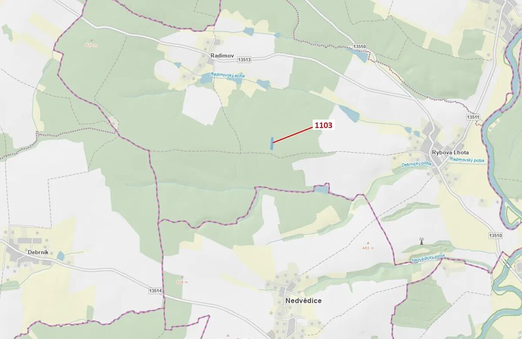 Lesní pozemek o výměře 2248 m2, parcelní číslo 1103, podíl 1/1, katastrální území Rybova Lhota, obec Skalice, obec s rozšířenou působností Soběslav, okres Tábor, Jihočeský kraj. Po těžbě.
