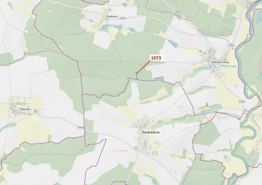 Lesní pozemek o výměře 2554 m2, parcelní číslo 1073, podíl 1/1, katastrální území Rybova Lhota, obec Skalice, obec s rozšířenou působností Soběslav, okres Tábor, Jihočeský kraj. Po těžbě.