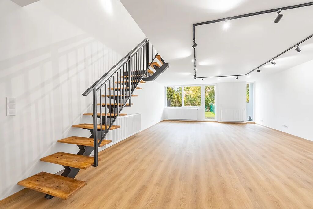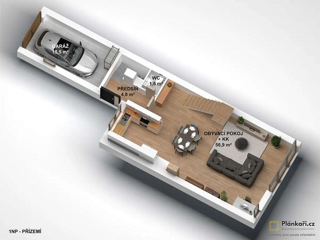 - Obývací pokoj o velikosti přes 56 m2 včetně kuchyňského koutu s kuchyňskou linkou na míru od českého truhláře