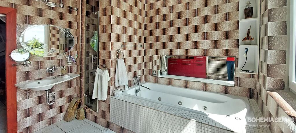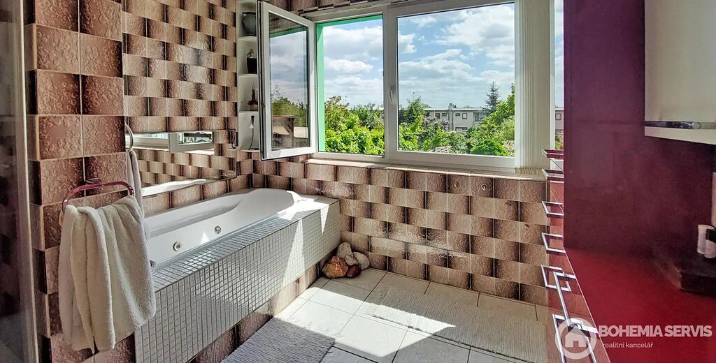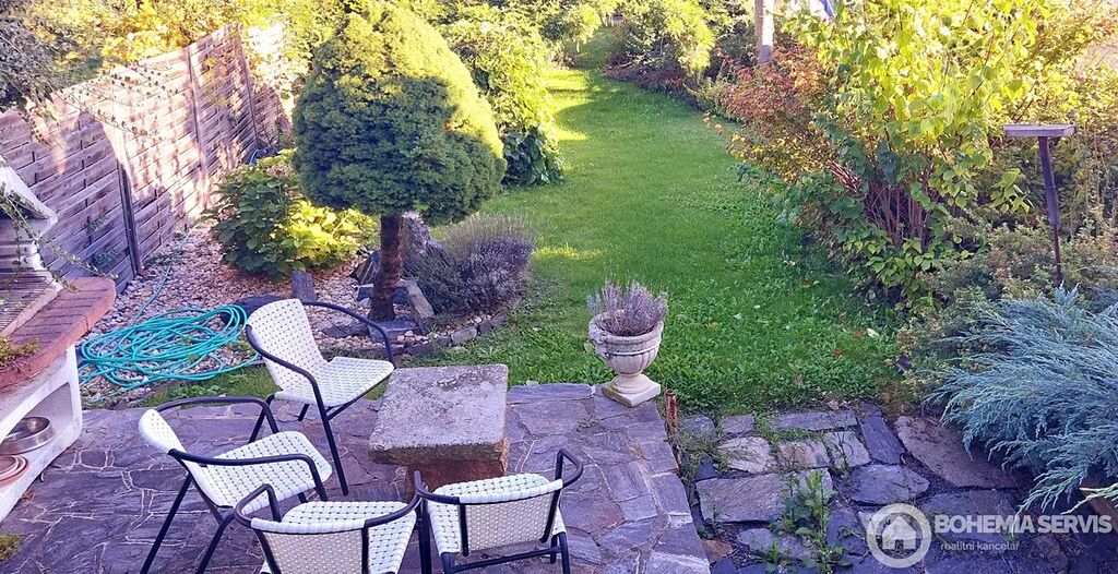 Rodinný řadový dům na jižním konci Čáslavi, užitná plocha 220 m2, s dispozicí 5+kk, pozemek 413 m2. Dům je vybavený solárními panely s dotovanou elektřinou, klimatizací a saunou v suterénní části domu. Okrasná zahrada poskytuje jedinečné soukromí s venkovním krbem a posezením na kamenné terase. Dále zde najdeme wellness koutek s nahřívacím sudem a chatkou pro soukromou relaxaci nebo posezení s přáteli. Dispozice interiéru: ze vstupní síně je vchod do chodby, Odtud vpravo do prostorné moderní kuchyně s jídelnou a zimní zahradou s výhledem do zeleně zahrady. Tento prostor je volně propojený s obývací částí domu, která je atypická s krbem a se vstupem na lodžii, Z chodby dále vedou dveře do suterénu, na WC, koupelny a schody do 1. NP. Tam najdeme pracovnu, dětský pokoj s lodžií, ložnici s vestavěnými skříněmi i lodžií a odpočinkový otevřený prostor. Celkově je interiér velmi světlý, prostorný a vkusně zařízený.