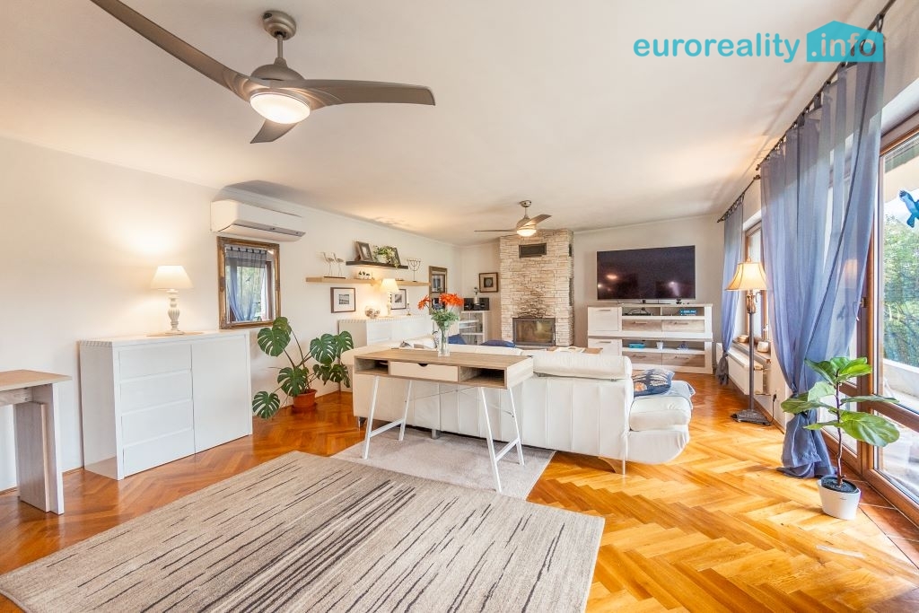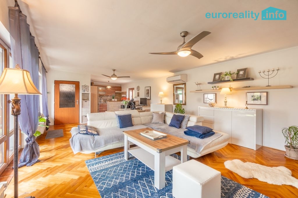 Přízemí (123 m²): bytová jednotka 4+kk – velký obývací pokoj s kuchyní, 2 ložnice, 1 pracovna, koupelna s vanou a sprchovým koutem, samostatné WC.