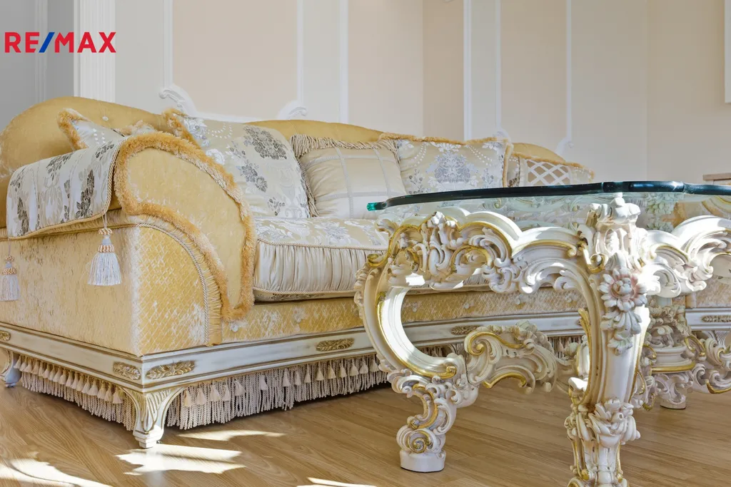 - Obývací pokoj s designovým zlatým gaučem, ručně vyřezávaným konferenčním stolkem a jídelním koutem s čalouněnými židlemi