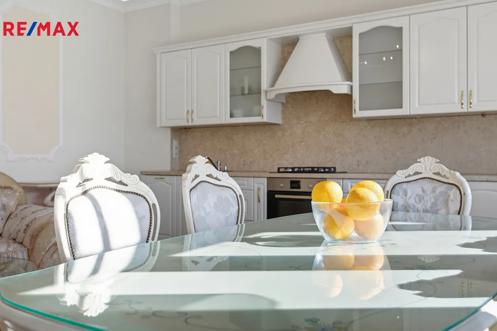 - Plně vybavená kuchyně s vestavnými spotřebiči a klasickými bílými skříňkami