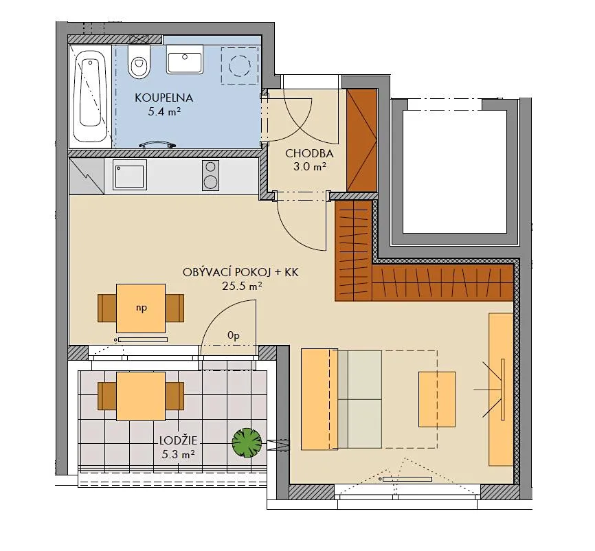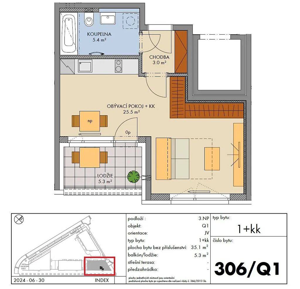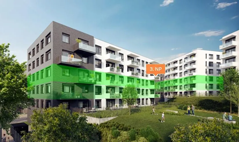 Bytová jednotka 1+kk o velikosti 35,1 m2 + balkon 5,3 m2 se nachází ve 3. nadzemním podlaží (z celkových šesti) s orientací na jihovýchod.