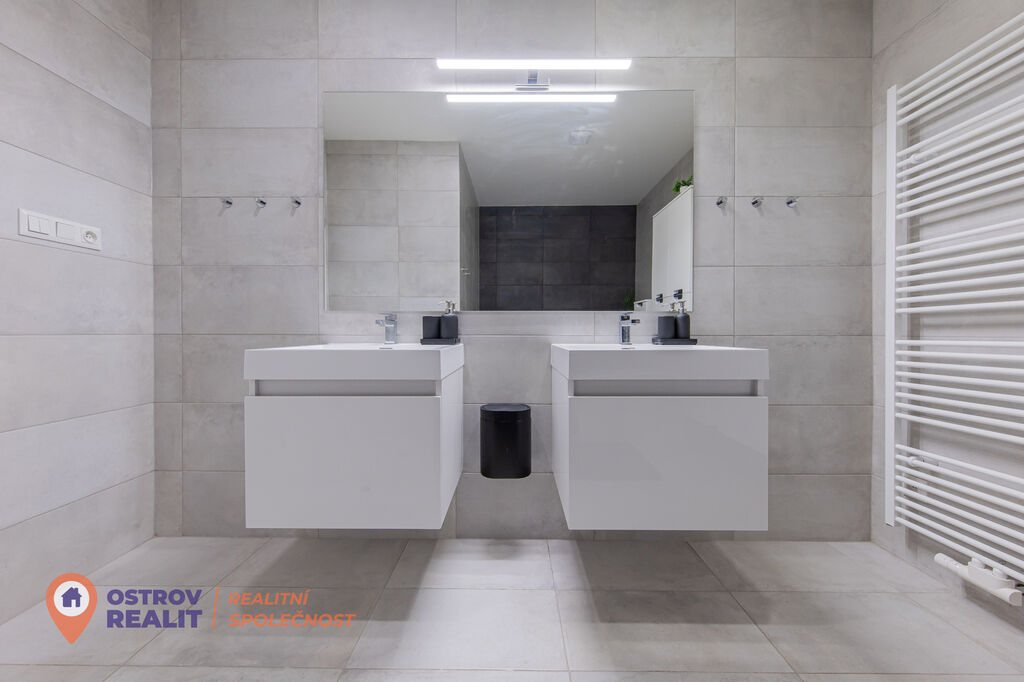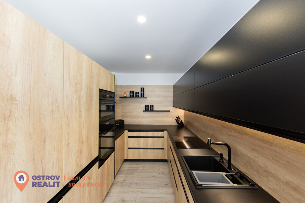 Na obývák navazuje elegantní kuchyně s vestavěnými spotřebiči. Další pokoje: hlavní ložnice, pokoj pro hosty, samostatná pracovna se vstupem na dvůr, šatna, technická místnost, dvě koupelny a dvě toalety – vše promyšlené do posledního detailu.