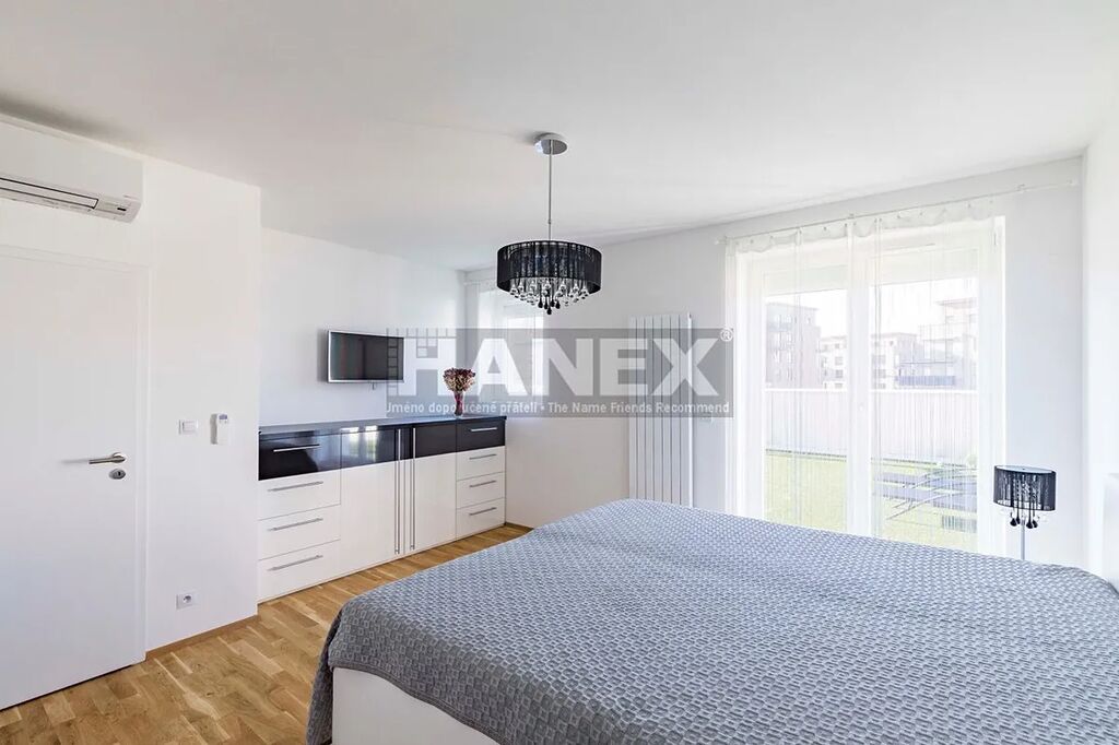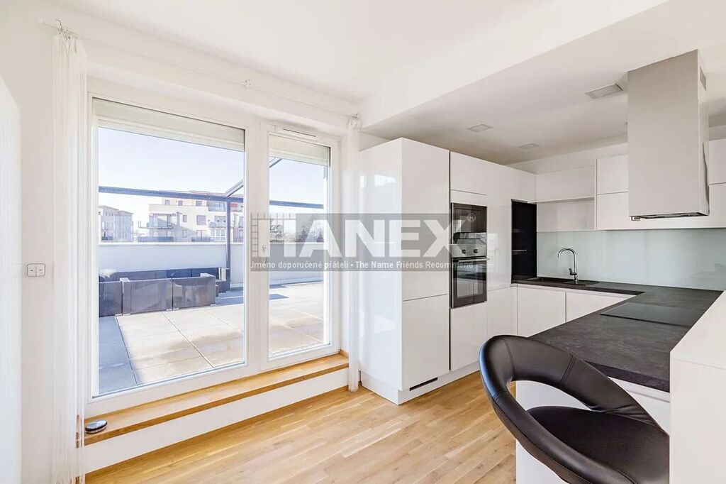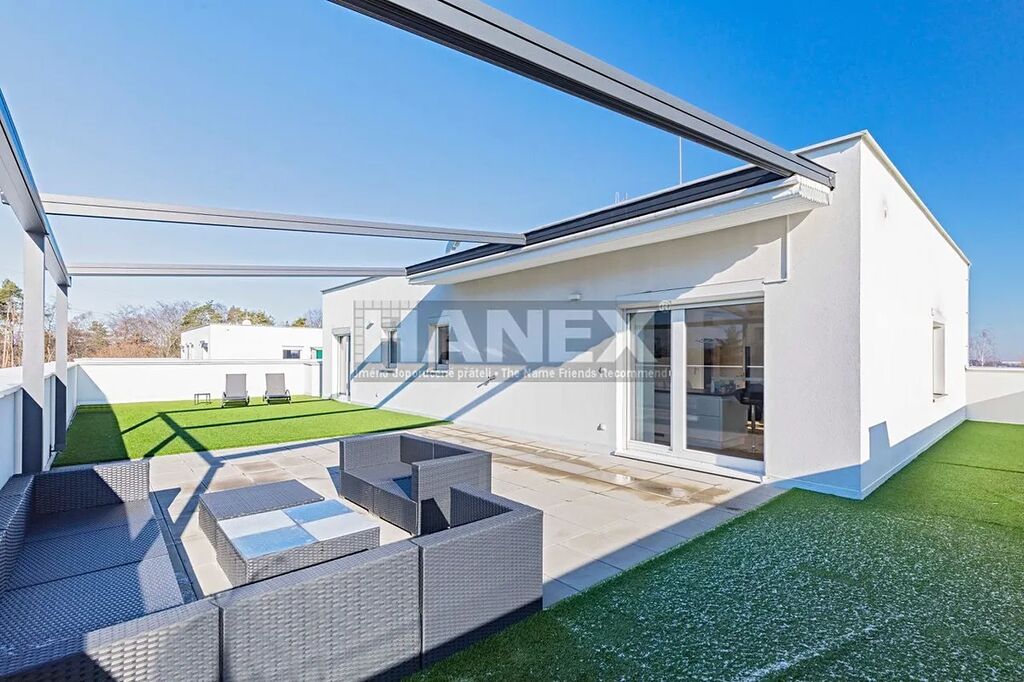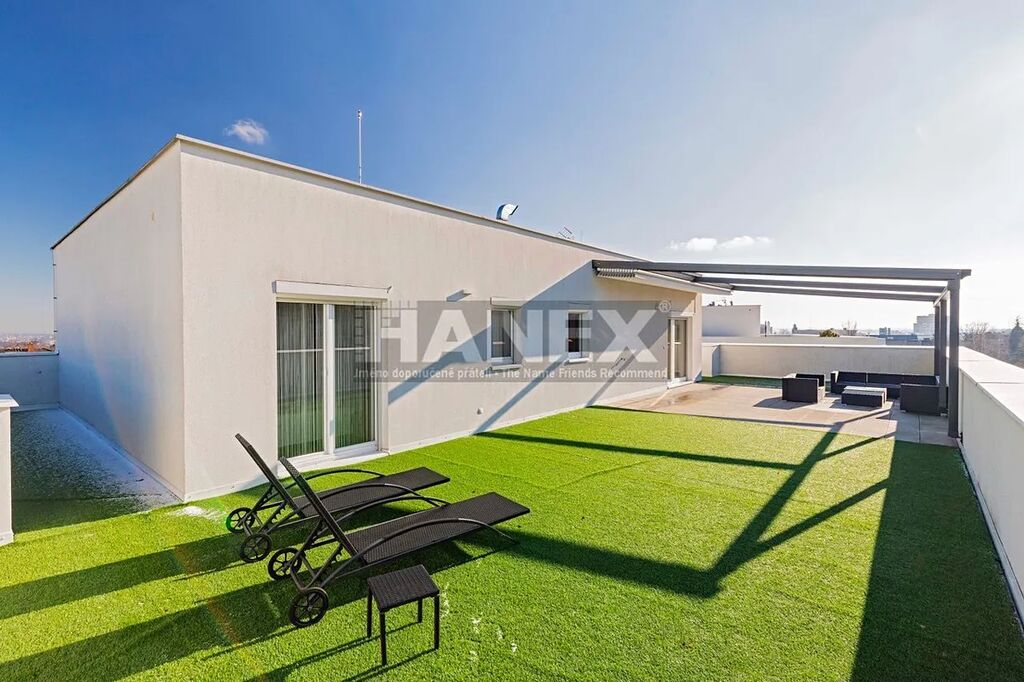 Luxusní kompletně zařízený střešní byt 3+kk (106 m2) s extra velkou terasou (128 m2). Plně klimatizovaný byt se nachází v posledním (2.) patře komorní rezidence s výtahem přímo do jednotky. Interiér bytu tvoří obývací pokoj s jídelním a kuchyňským koutem a vstupem na slunnou terasu s krásným výhledem. Dále jsou zde dvě ložnice, koupelna s vanou, sprchovým koutem, toaletou a samostatná toaleta. Plně vybavená kuchyňská linka v bílém lesku s vestavěnými spotřebiči a snídaňovým barem. Velké množství úložných prostor ve vestavěných skříních na míru v ložnicích i v chodbě. Elektrické rolety v oknech, elektrická markýza na terase. K bytu náleží garážové stání a sklepní kóje (3 m2). Jednotka se nachází v rezidenčním projektu Viladomy Na Vidouli jehož součástí je soukromý parkový areál. Projekt nabízí poklidnou atmosféru v blízkosti golfového hřiště Motol, tenisových kurtů a rozsáhlých parků. Vynikající občanská vybavenost v blízkém okolí a výborná dostupnost nejen do centra města. Pár kroků od domu je stanice autobusu s přímou návazností na linky metra A nebo B. Nákupní a zábavní centrum Metropole Zličín a Galerie Butovice v blízkosti.