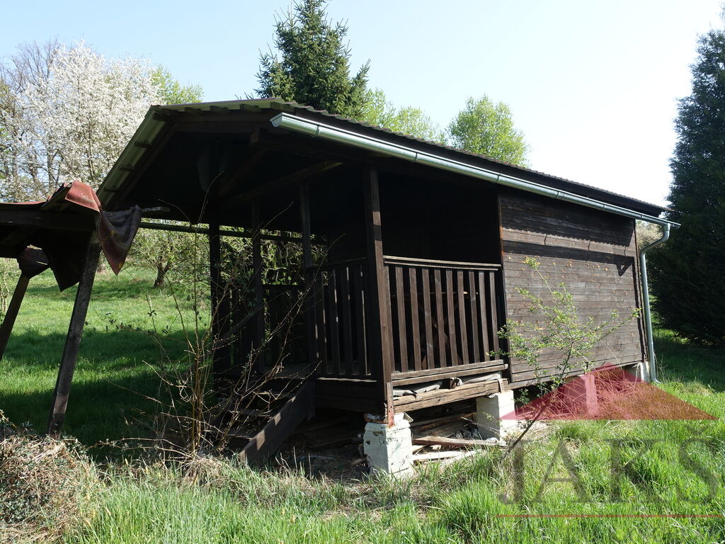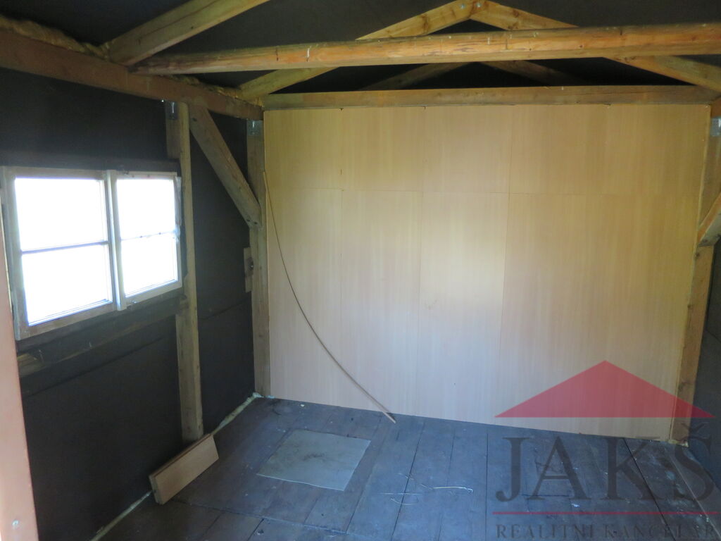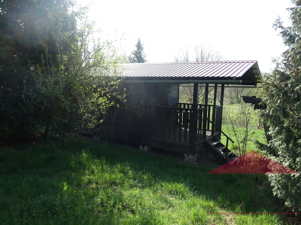 Popis: dřevěná chata 6x3 m: veranda 2x3 m, místnost 3x3 m, sklad nářadí 1x3 m.