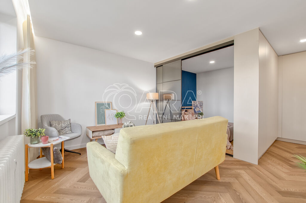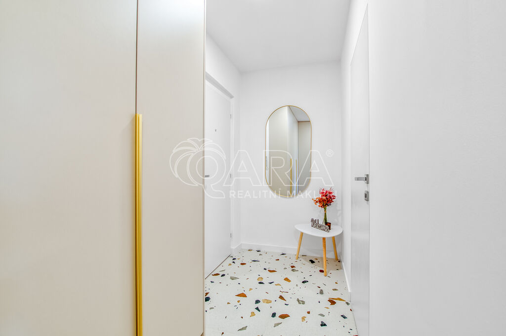 V roce 2025 prošel byt kompletní rekonstrukcí pod vedením designérů, která trvala devět měsíců. Vzniklo nové zděné jádro se sprchovým koutem, nová elektroinstalace v mědi, omítky i snížené sádrokartonové stropy s osvětlením. Podlahy byly vylity (předsíň a kuchyň anhydrid, obývací část původní dřevěné parkety zalité nivelací) a vyrovnány. V předsíni a koupelně je dlažba, v obytné části kvalitní vinyl. Vstup zajišťují nové protipožární dveře.