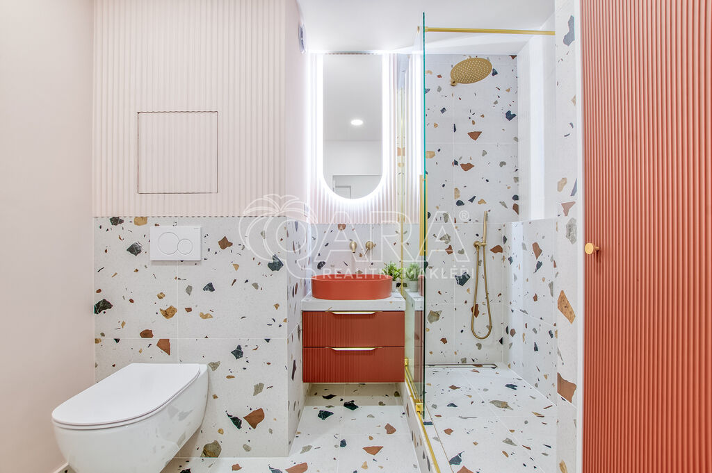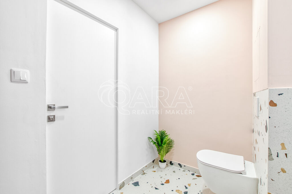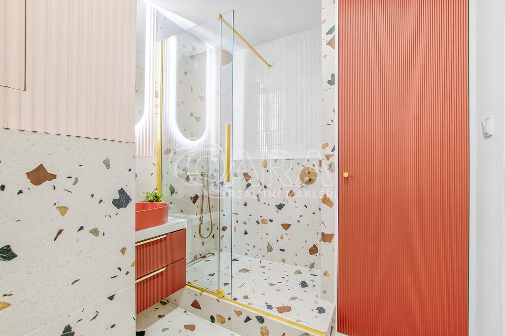 Koupelna s toaletou je přístupná přes bezfalcové dveře se skrytými zárubněmi. Stěny jsou obloženy keramickým obkladem v dekoru Terrazzo, ve sprchovém koutě je bílý malometrážní obklad. Za zrcadlem s LED osvětlením je dekorativní, malovatelný panel v lososovém odstínu. Podomítkové baterie v matně zlatém chromu doplňují čistý a elegantní vzhled. Samozřejmostí je prostor pro pračku a sušičku ukrytý za dvířky.
