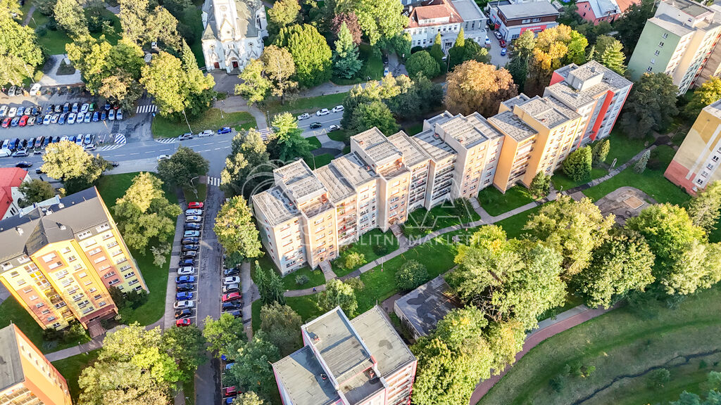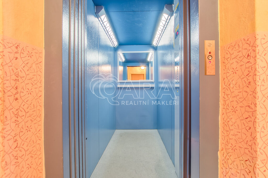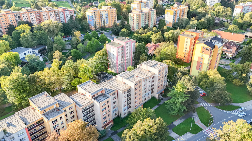 Byt se nachází v nejvyšším podlaží revitalizovaného panelového domu. Do pátého patra vás doveze prostorný výtah, poté se pokračuje po krátkém schodišti do šestého podlaží. Díky umístění pod střechou nabízí byt naprosté soukromí a klid. Z oken se otevírá příjemný výhled na kostel sv. Bartoloměje a do okolní přírody.