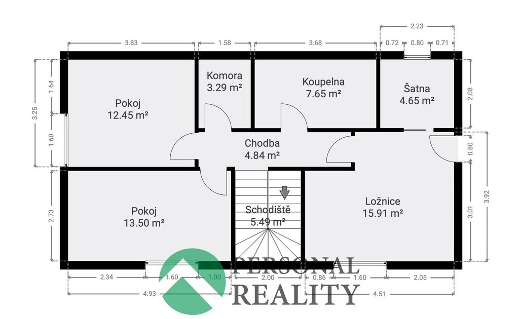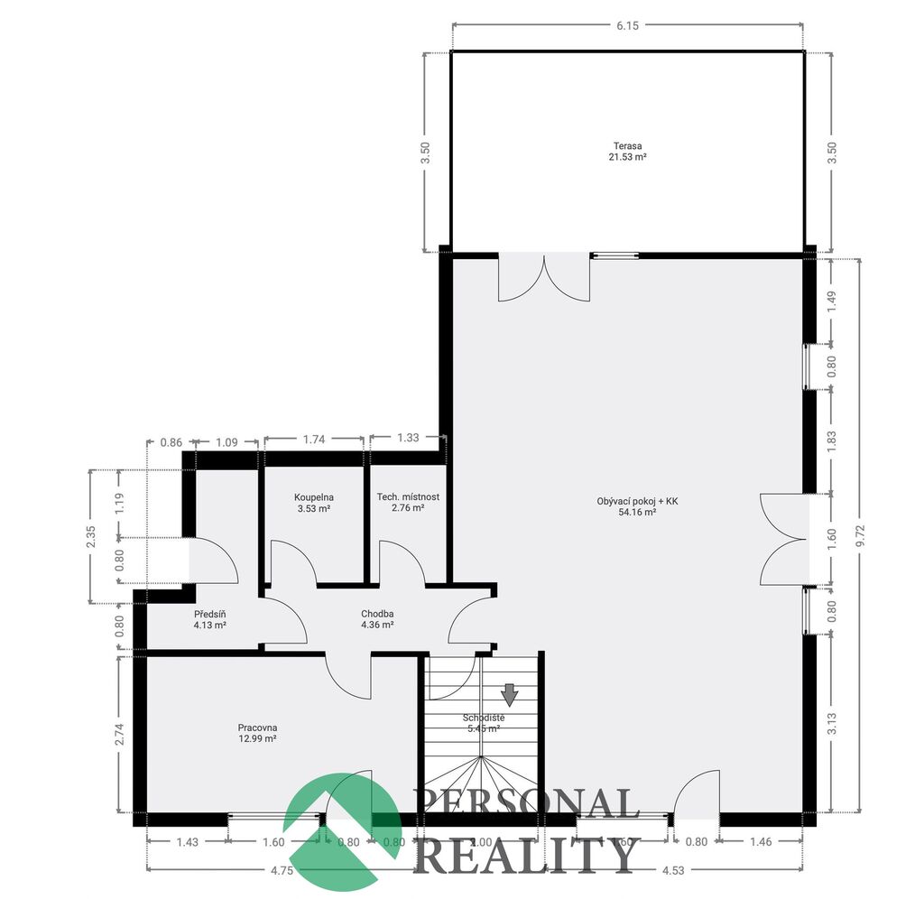 - Spodní patro zahrnuje prostorný obývací pokoj s kuchyňským koutem a přímým výhledem do zahrady, pracovnu, technickou místnost s prádelnou, koupelnu s WC a sprchovým koutem předsíň.