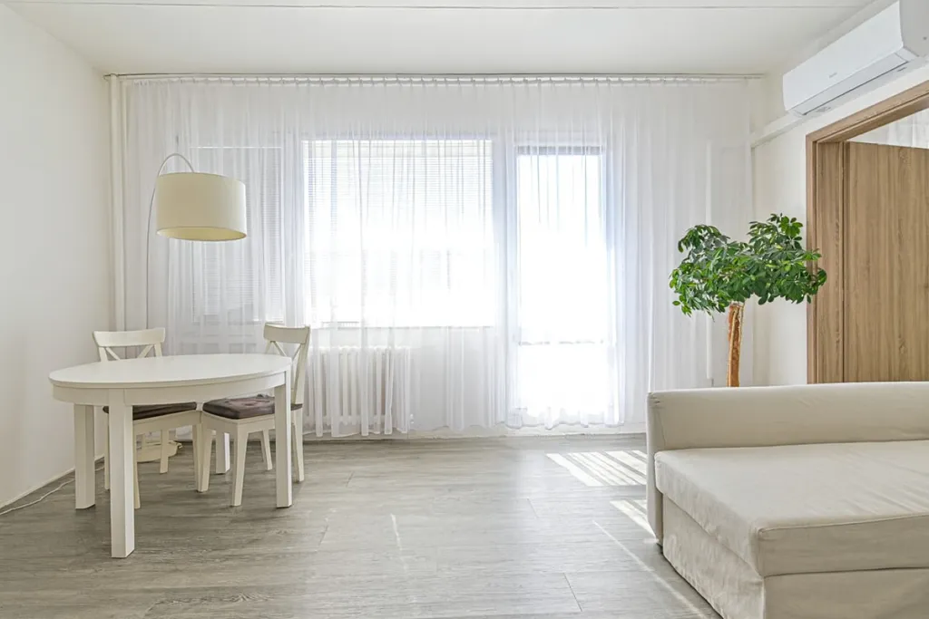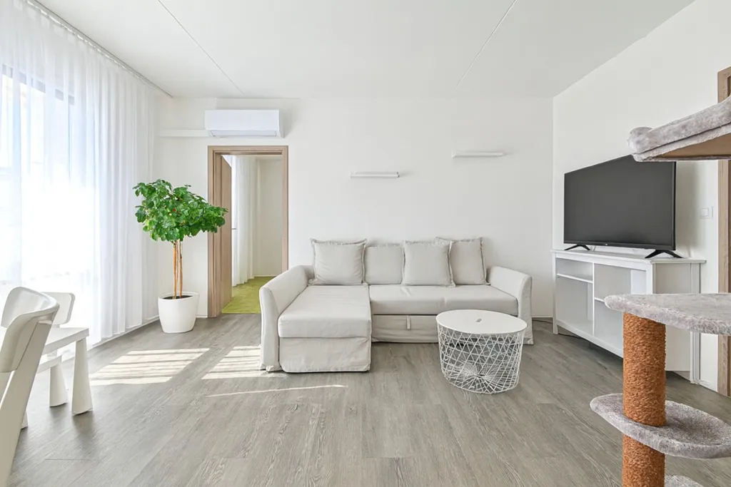 Dominantou je obývací pokoj, který je prostorný a velmi světlý díky velkým oknům a světlé podlahy v dekoru dřeva. Celý prostor působí vzdušně a čistě.