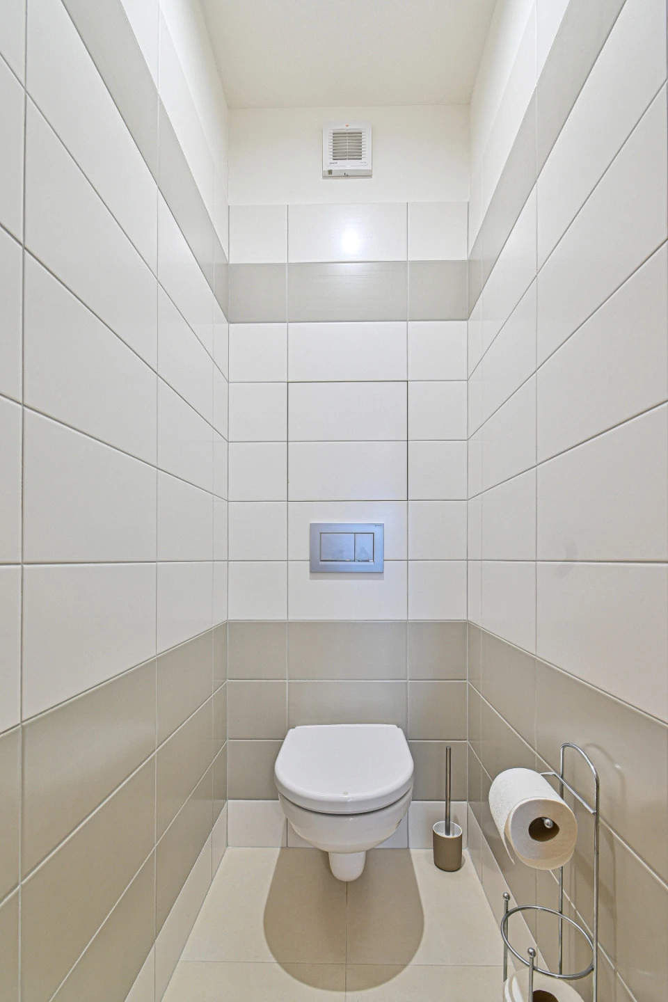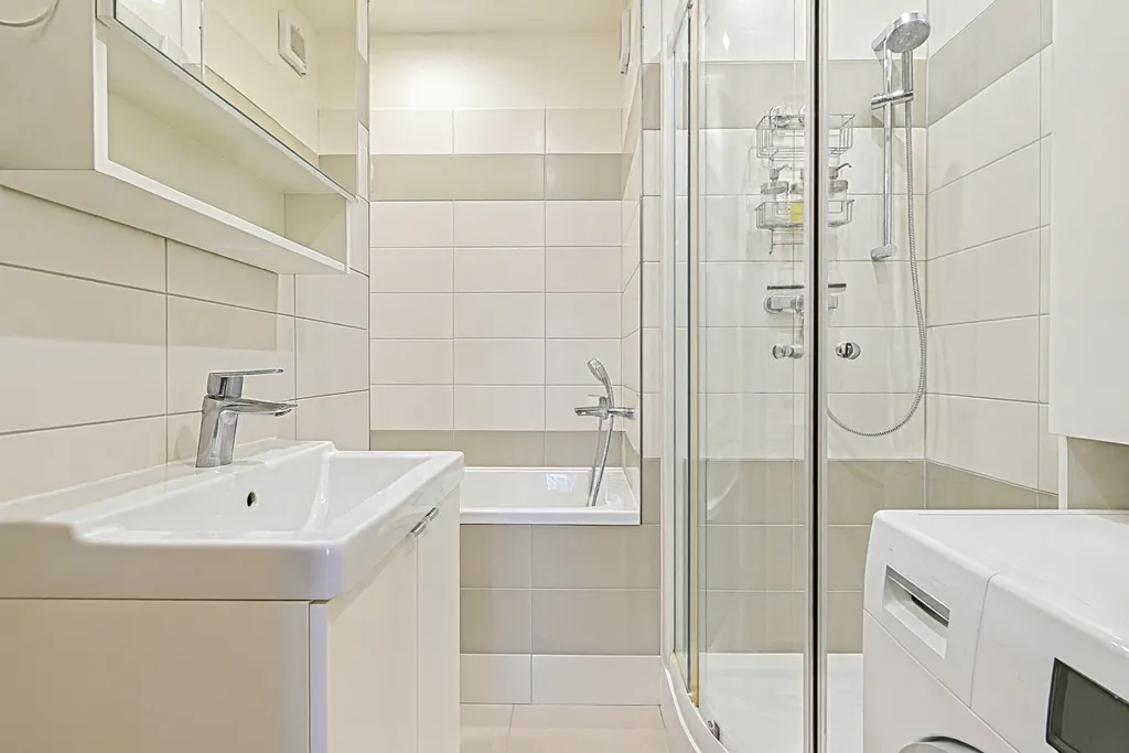 V koupelně je k dispozici vana, sprchový kout, pračka a umyvadlo. Toaleta je umístěna samostatně.