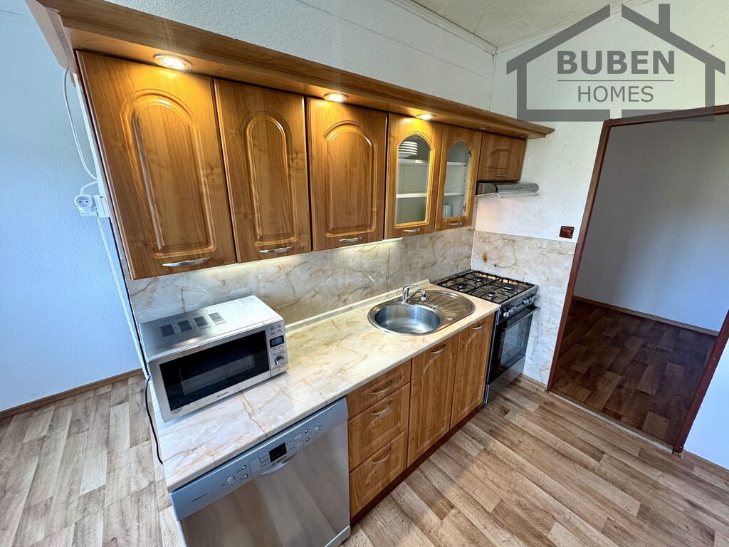 Byt tvoří prostorná vstupní chodba, kuchyň, prostorný obývací pokoj (16,30 m2), dvě ložnice (12m2, 16 m2), koupelna se sprchovým koutem a samostatné WC.