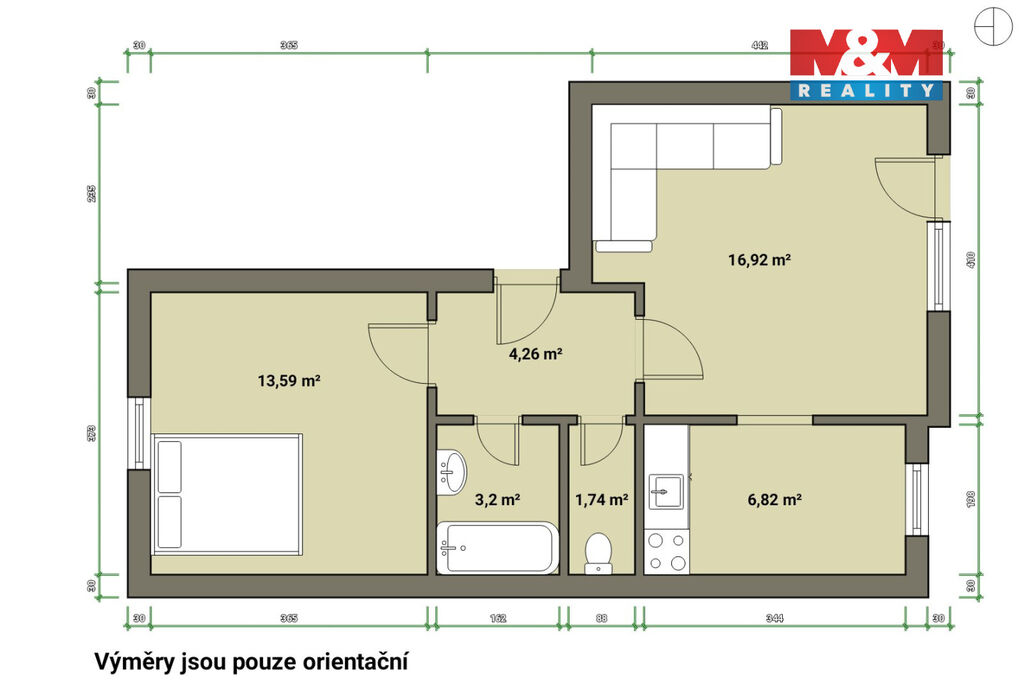 Byt se nachází v 1. nadzemním podlaží cihlového čtyřpodlažního domu s jedním podzemním podlažím. Dispozičně nabízí prostorný obývací pokoj propojený s kuchyňským koutem, ložnici, koupelnu, samostatné WC a předsíň. Celkově působí velmi prakticky a je ideální pro jednotlivce, pár či jako investiční nemovitost s možností dlouhodobého i krátkodobého pronájmu.