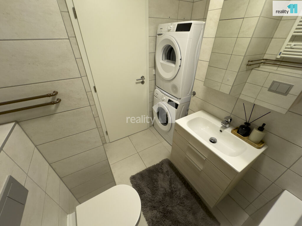 Byt je dispozičně členěn na obývací pokoj s kuchyní, ložnici s balkónkem, předsíní, koupelnou s WC dohromady (s vanou a umyvadlem) a šikovným koutem na pračku a sušičku.