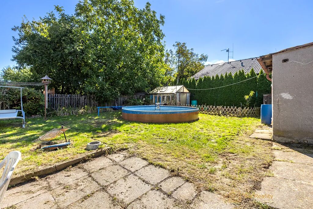 Pozemek je rovinatý, zatravněný a kompletně obklopený zelení. I tady budete mít spoustu místa pro vaše každodenní aktivity s dětmi. Jistě také oceníte kopanou studnu na pozemku.