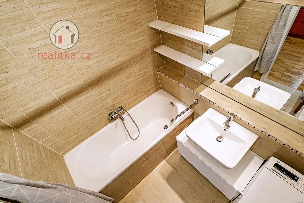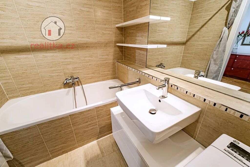 • Koupelna: Vana, podlahové vytápění a žebřík na sušení, keramický obklad a dlažba