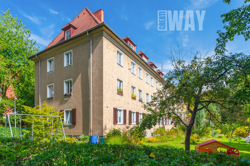 K bytu náleží oplocená soukromá zahrada, kde na 2.262 zatravněných m2 najdete vzrostlé stromy, posezení u ohniště i sušáky na prádlo. Zahrada slouží výhradně obyvatelům domu, takže pokud chcete zkombinovat výhody bydlení v bytě s možností pobývat ve vlastní zeleni, toto je ta správná nabídka.