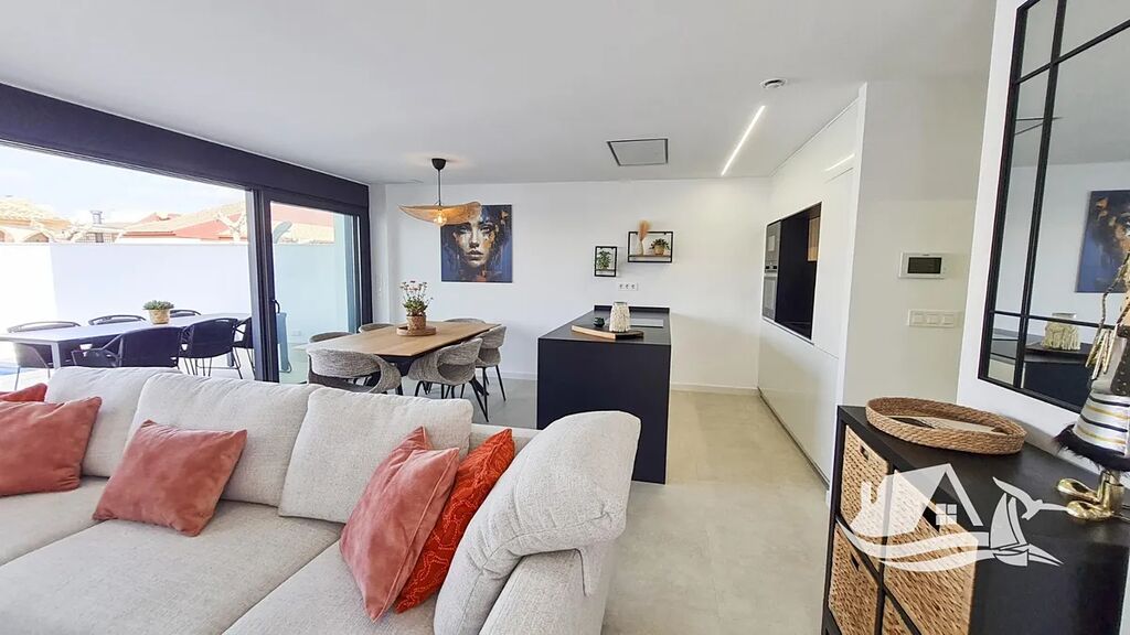 Interiér je navržen tak, aby přinášel maximální komfort a funkčnost. Velká okna přivádějí dostatek denního světla a propojují vnitřní a venkovní prostor. Kuchyň je plně vybavena moderními spotřebiči Balay, v koupelnách najdete elegantní prosklené sprchové kouty a v ložnicích vestavěné šatní skříně. Díky přípravě na centrální klimatizaci a solárním panelům nabízí vila i dlouhodobě úsporný provoz.