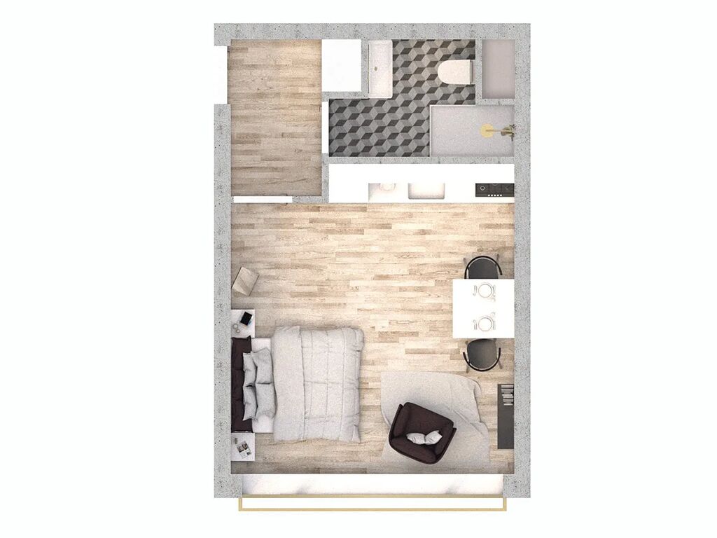 Útulný byt s velkým panoramatickým oknem o dispozici 1+kk se nachází v jihozápadním cípu budovy ve třetím nadzemním podlaží. V předsíni se nachází nika s přípravami pro napojení pračky, koupelna je vybavená umyvadlem, WC a prodlouženým sprchovým koutem. Ze zádveří byt pokračuje do hlavního obytného prostoru s přípravami pro napojení kuchyňské linky a prostorem pro stolování a obývací část. Velké okno místnosti se snížením parapetem je orientováno na západ. V obývací části je vyveden optický kabel pro připojení k vysokorychlostnímu internetu.