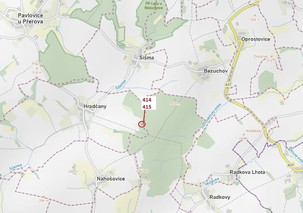 Lesní pozemek o výměře 975 m2, parcelní čísla 414, 415, podíl 1/1, katastrální území Hradčany na Moravě, obec Hradčany, obec s rozšířenou působností Přerov, okres Přerov, Olomoucký kraj. Po těžbě.