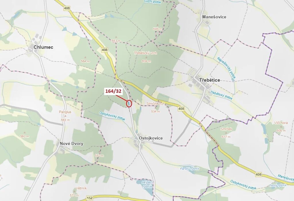 Lesní pozemek o výměře 1817 m2, parcelní číslo 164/32, podíl 1/1, katastrální území Ostojkovice, obec Budíškovice, obec s rozšířenou působností Dačice, okres Jindřichův Hradec, Jihočeský kraj.