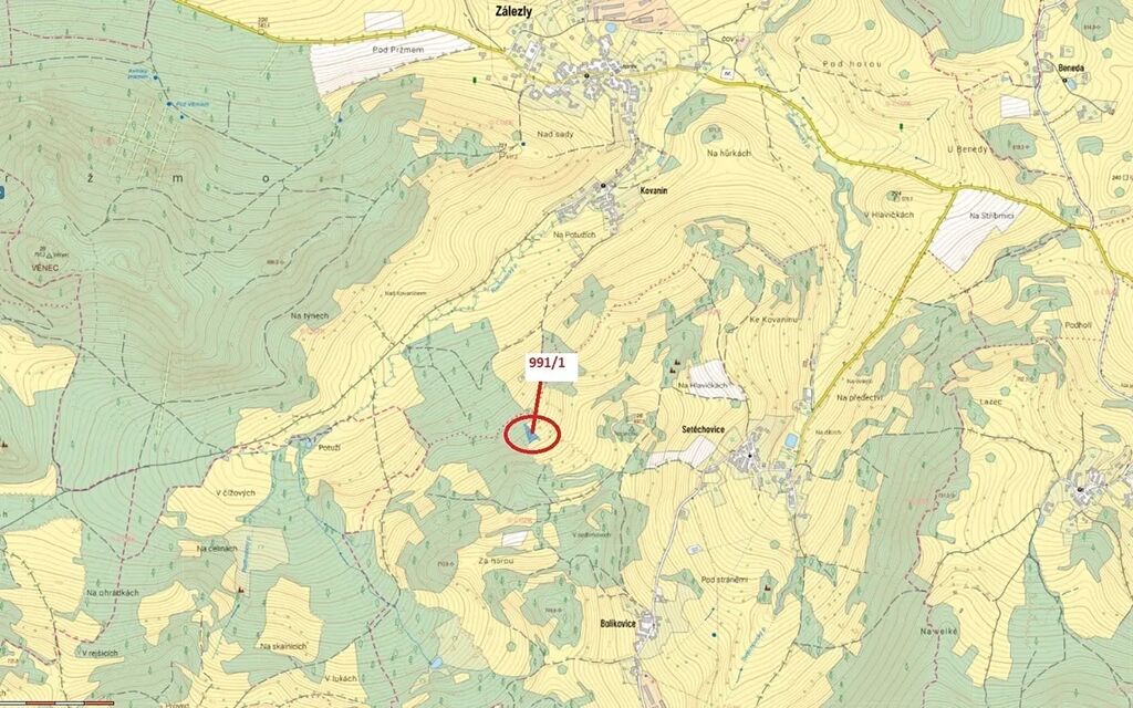 Ostatní plocha o výměře 1482 m2, parcelní číslo 991/1, podíl 1/1, katastrální území Setěchovice, obec Zálezly, obec s rozšířenou působností Vimperk, okres Prachatice, Jihočeský kraj.