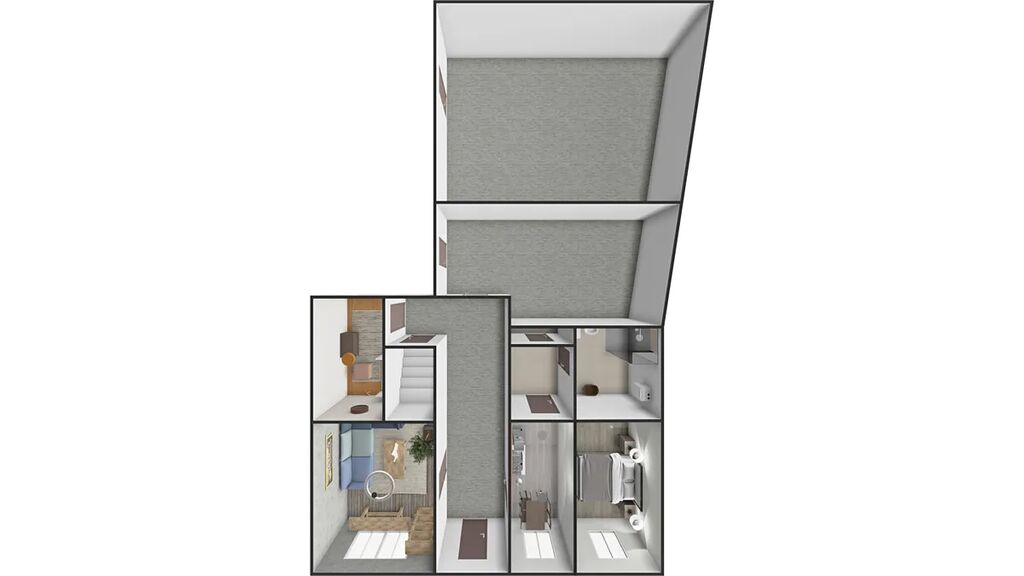 Středem domu vede chodba, kterou se vzchází do zahrady přes navazující prostor dílny. Po levé straně se nachází obývací pokoj a na konci chodby malá ložnice. Po pravé straně vstup do kuchyně a následně koupelny a druhé větší ložnice.