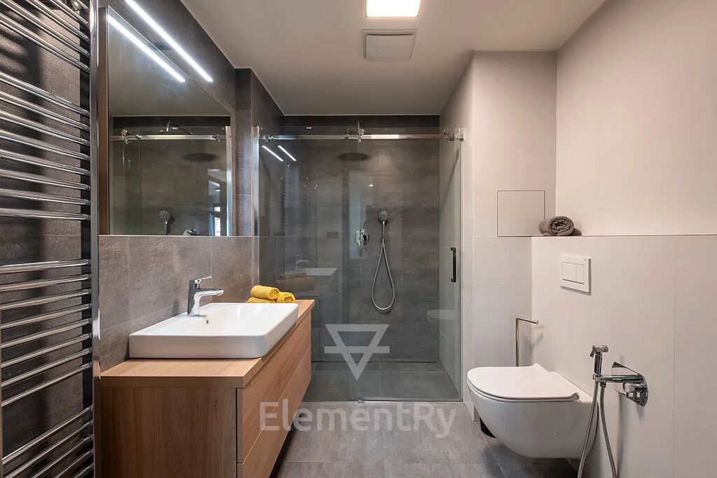 • Koupelna se sprchovým koutem, toaletou a vestavěnou umyvadlovou skříňkou.