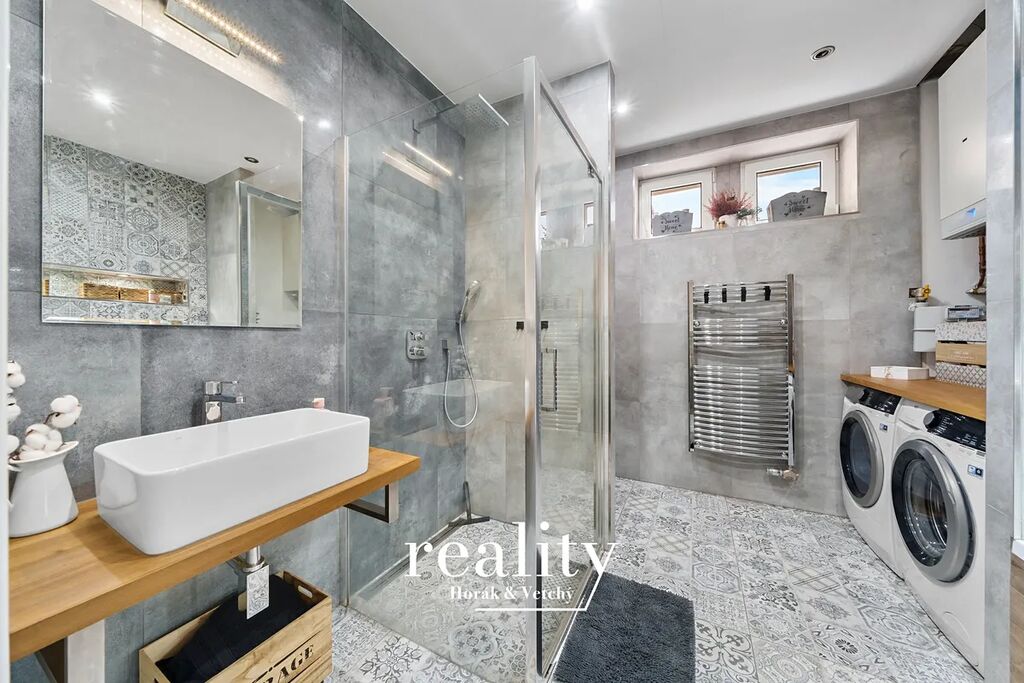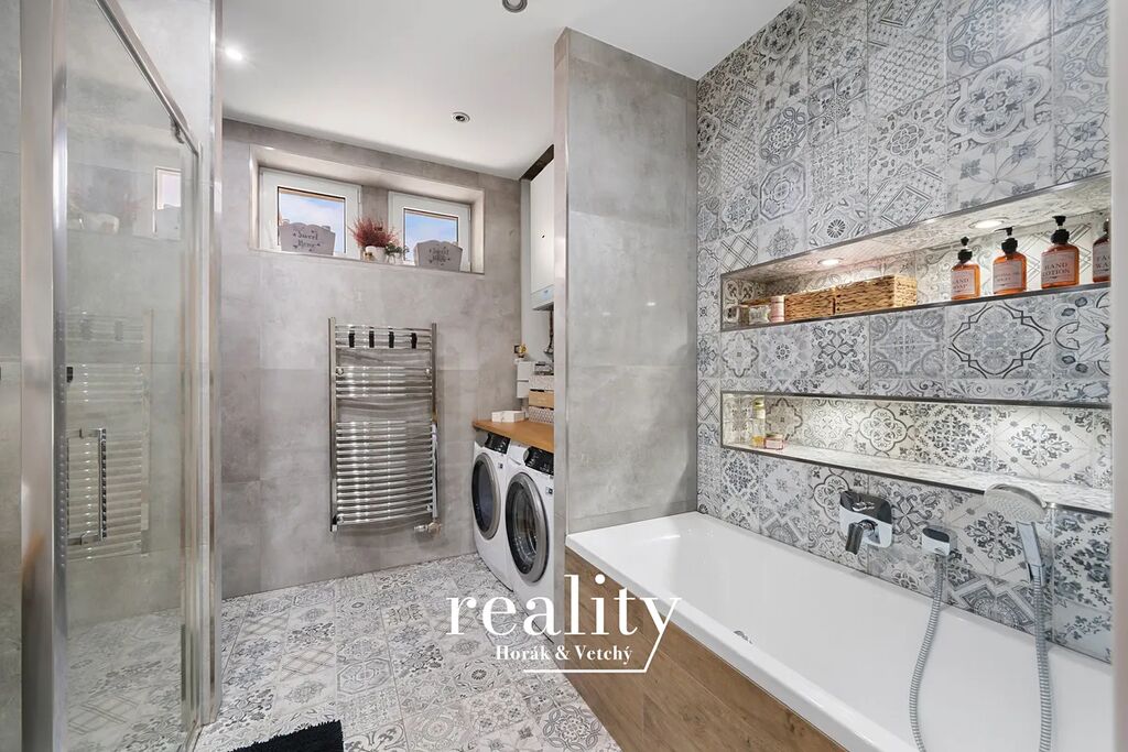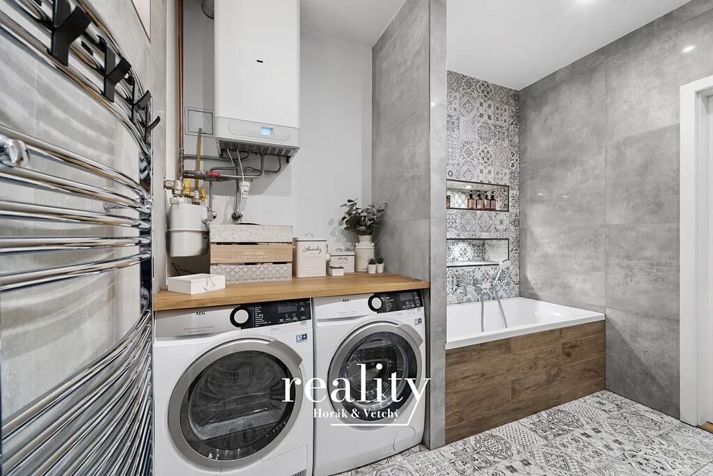 Disponuje praktickým dispozičním řešením, velkou koupelnou s vanou i sprchovým koutem a odděleným místem pro pračku a sušičku.