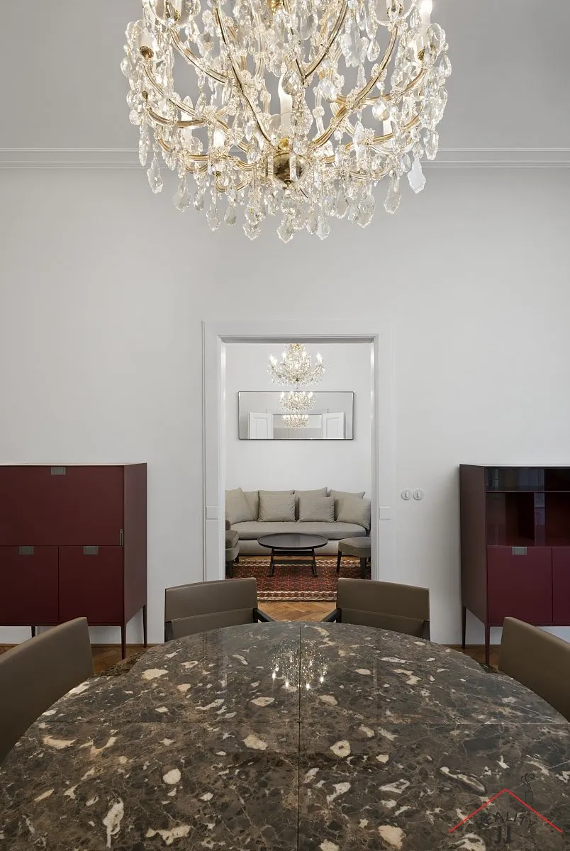 V bytě jsou parketové podlahy, štukové stropy a křišťálové lustry.
