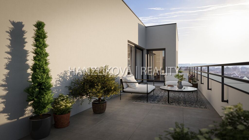 prostorné chodby, která nabízí dostatek místa pro vestavné skříně a úložné prostory celé rodiny, dvou koupelen, přičemž jedna slouží jako rodinná a druhá je součástí ložnice, samostatné toalety, hlavní obytné části s kuchyňským koutem a jídelnou, ze které je přes portálové dveře vstup na terasu a zelené plochy, 3 pokojů, šatny, pracovny a ložnice. Součástí bytu je terasa o výměře 19,48 m2 a zelená střecha o výměře 12,47 m2 a 4,9 m2 a dále sklepní kóje umístěná v suterénu domu.