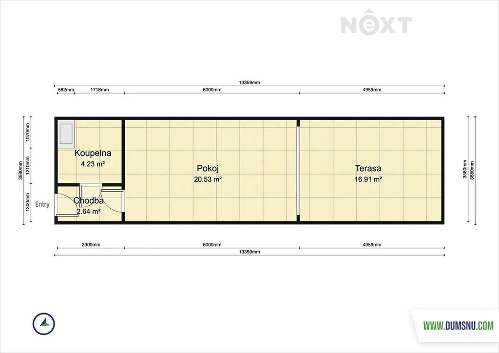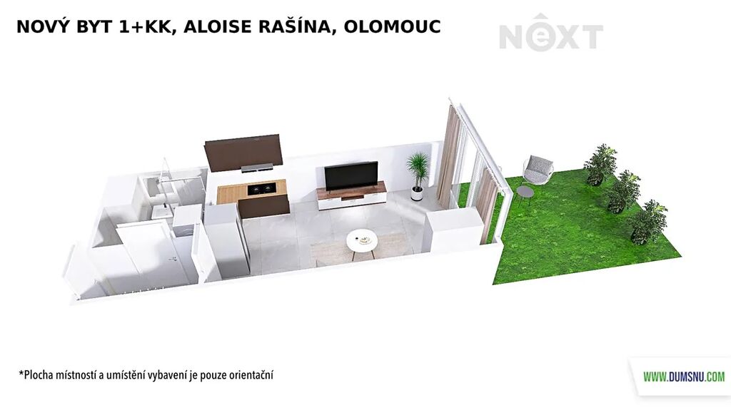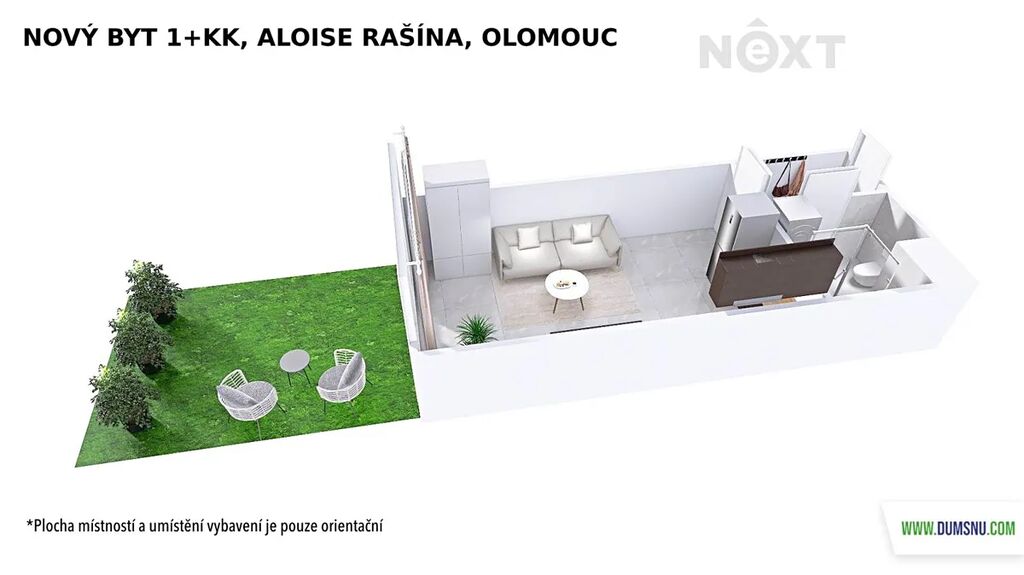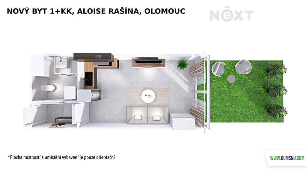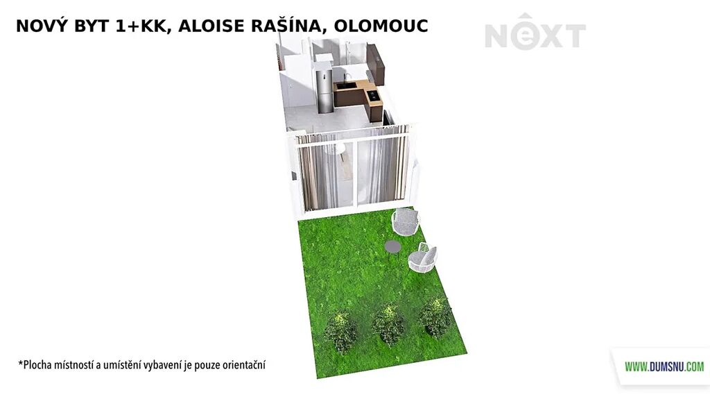 Představuje jej pokoj s kuchyňským koutem, chodba a koupelna, kde se nachází sprchový kout, umyvadlo se zrcadlovou skříňkou a wc. Je zde i prostor na pračku se sušičkou. Kuchyňská linka bude nově instalována – na fotografii je její vizualizace. Její součástí bude vestavěná lednice a mrazák, elektrická trouba, indukční varná deska a digestoř. Z pokoje vyjdete na předzahrádku o velikosti 17 m2, ideální pro ranní kávu, večerní relax nebo pěstování bylinek.
