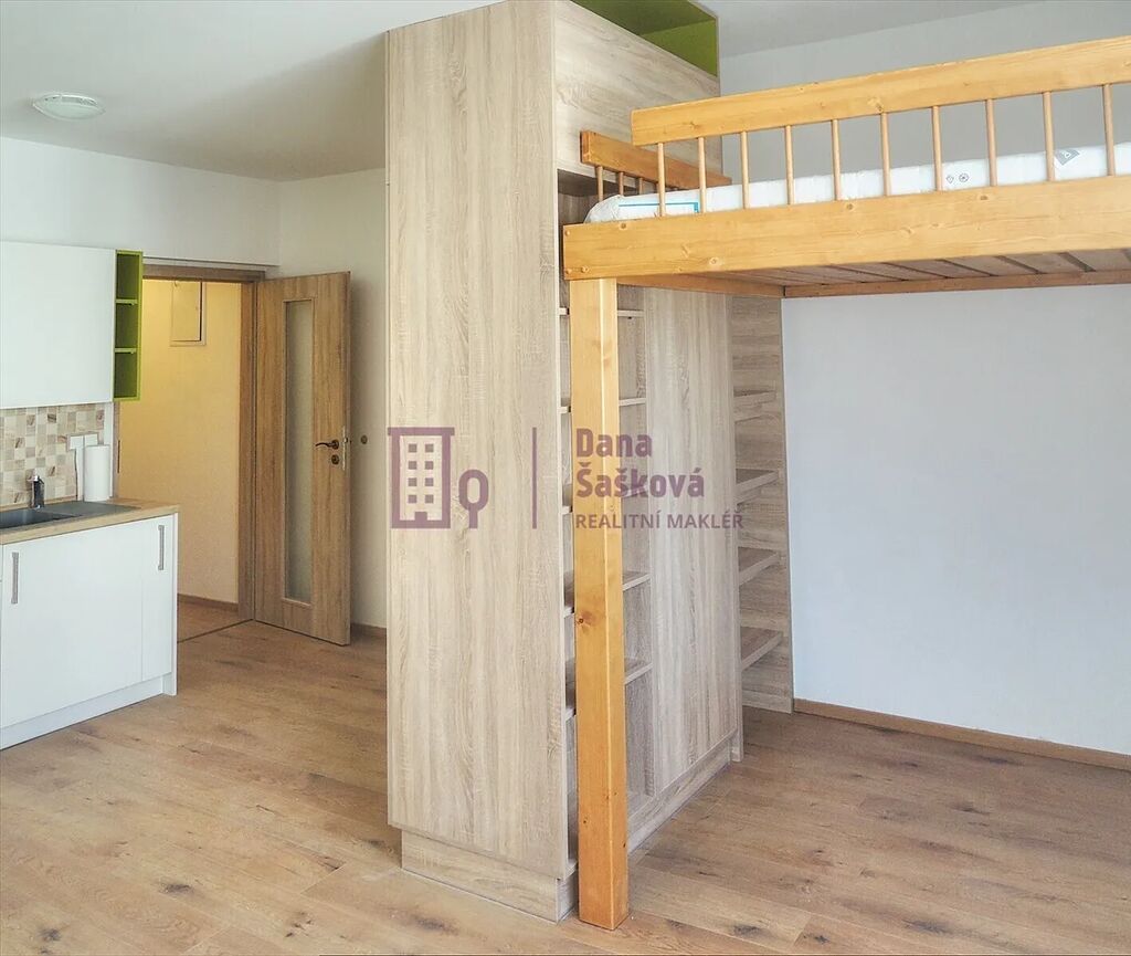 Dispozice 1+kk nabízí předsíň, koupelnu se sprchovým koutem a toaletou, obývací pokoj s kuchyňským koutem a vyvýšenou patrovou postelí.