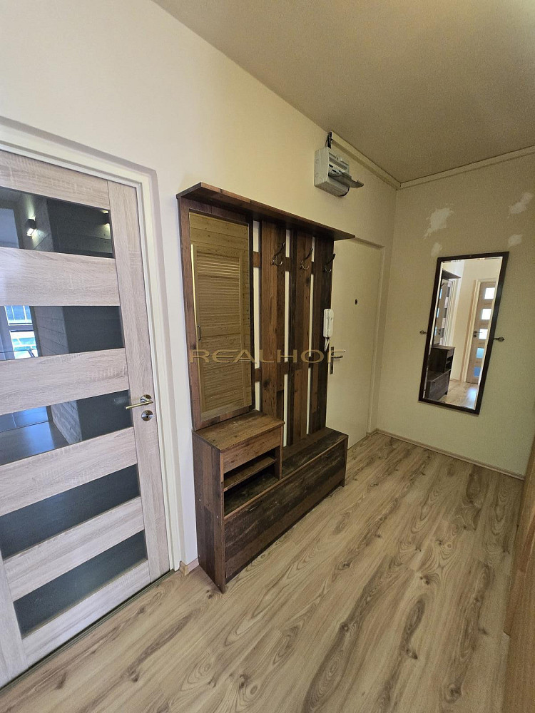 Dispozice bytu zahrnuje vstupní předsíň s odložkou, 2 pokoje, kuchyni s jídelním stolem a kompletně vybavenou elektrickou troubou, varnou deskou, mikrovlnkou a lednicí s mrazákem.
