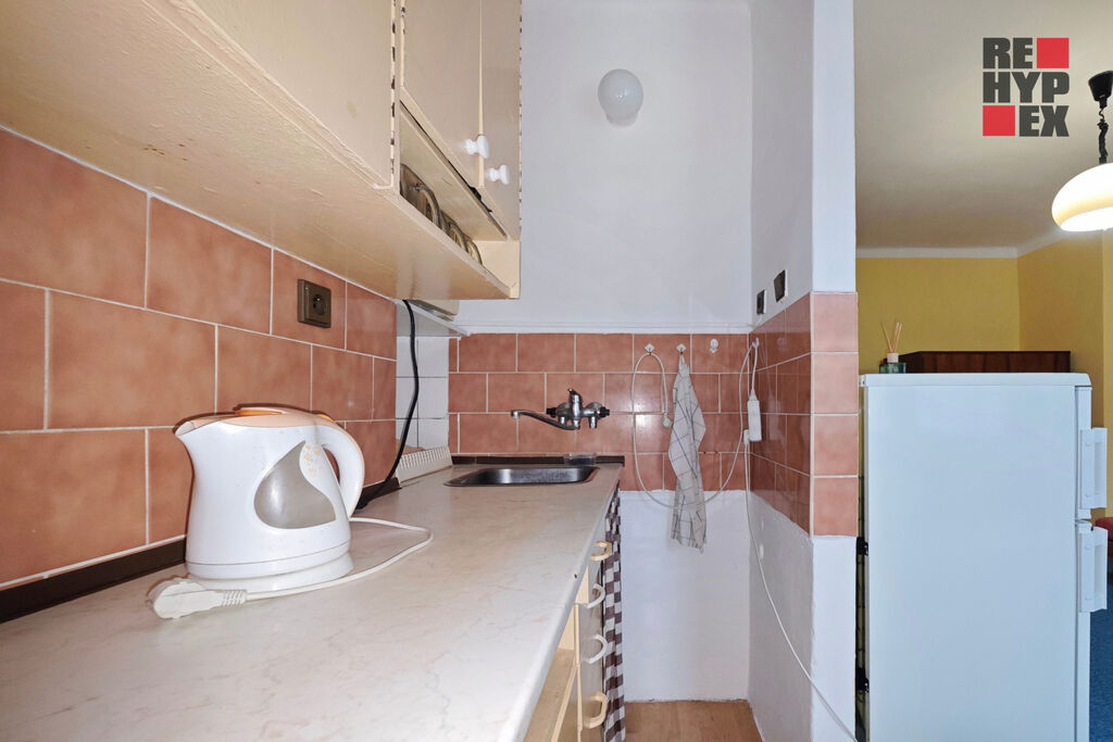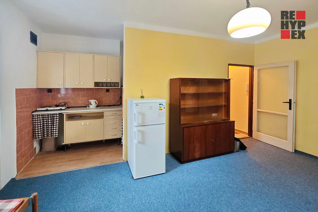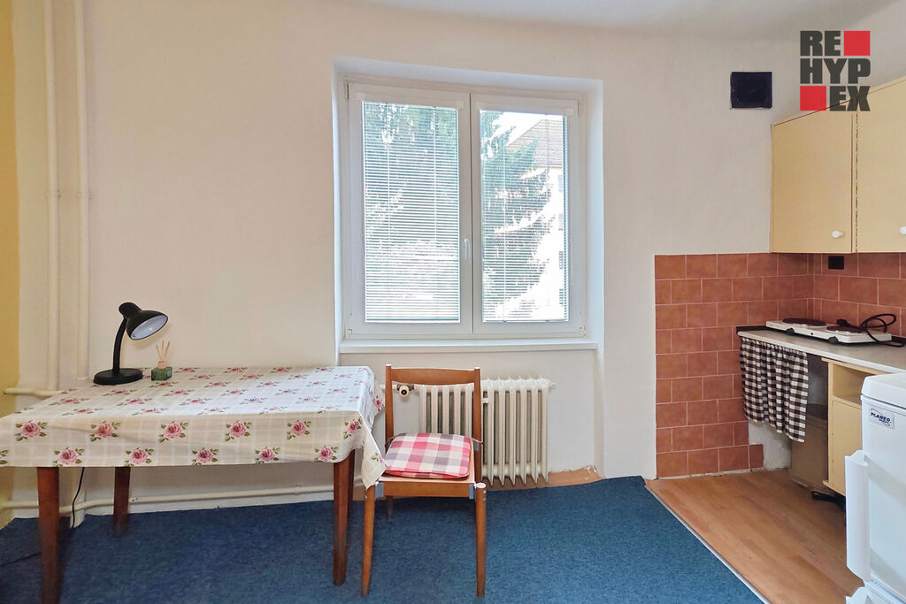 Nabízíme k pronájmu útulný byt 1+kk o celkové ploše 27,6 m² v cihlovém domě na sídlišti nedaleko městského centra. Byt se nachází v 1NP a je v dobrém stavu. Vytápění je zajištěno ústředním dálkovým topením. Je vybavený starší kuchyňskou linkou, elektrickým vařičem, rychlovarnou konvicí, mikrovlnnou troubou, lednicí s mrazákem a stolem s dvěma židlemi. Dále koupelnou se sprchovým koutem, WC a místem pro připojení automatické pračky. V bytě je možnost připojení na internet pomocí pevného nebo optického kabelu. K bytu náleží také sklepní kóje.