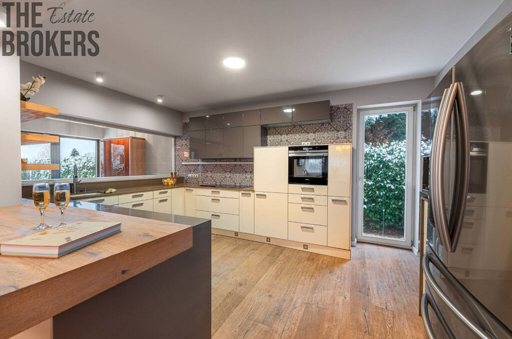 Vila disponuje velkorysým interiérem, který nabízí široké možnosti využití dle individuálních potřeb nového majitele. V přízemí se nachází reprezentativní vstupní hala, prostorná předsíň, samostatná šatna a technická místnost. Moderní kuchyň je plně vybavená nejnovějšími spotřebiči a navazuje na světlou jídelnu a obývací část. Dále zde naleznete útulnou ložnici a elegantní koupelnu.