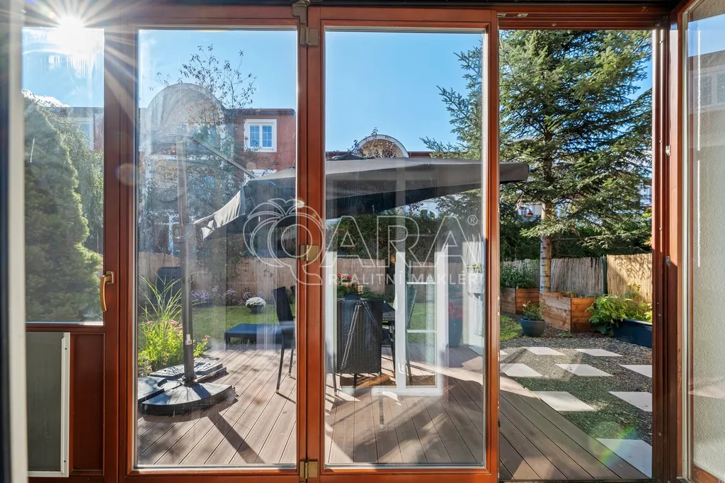 Dominantou bytu je obývací pokoj s kuchyňským koutem, ze kterého se přes zimní zahradu dostanete na západně orientovanou předzahrádku o velikosti 106 m². Ta nabízí příjemné posezení, dostatek soukromí a možnost trávit čas venku prakticky od jara do podzimu.