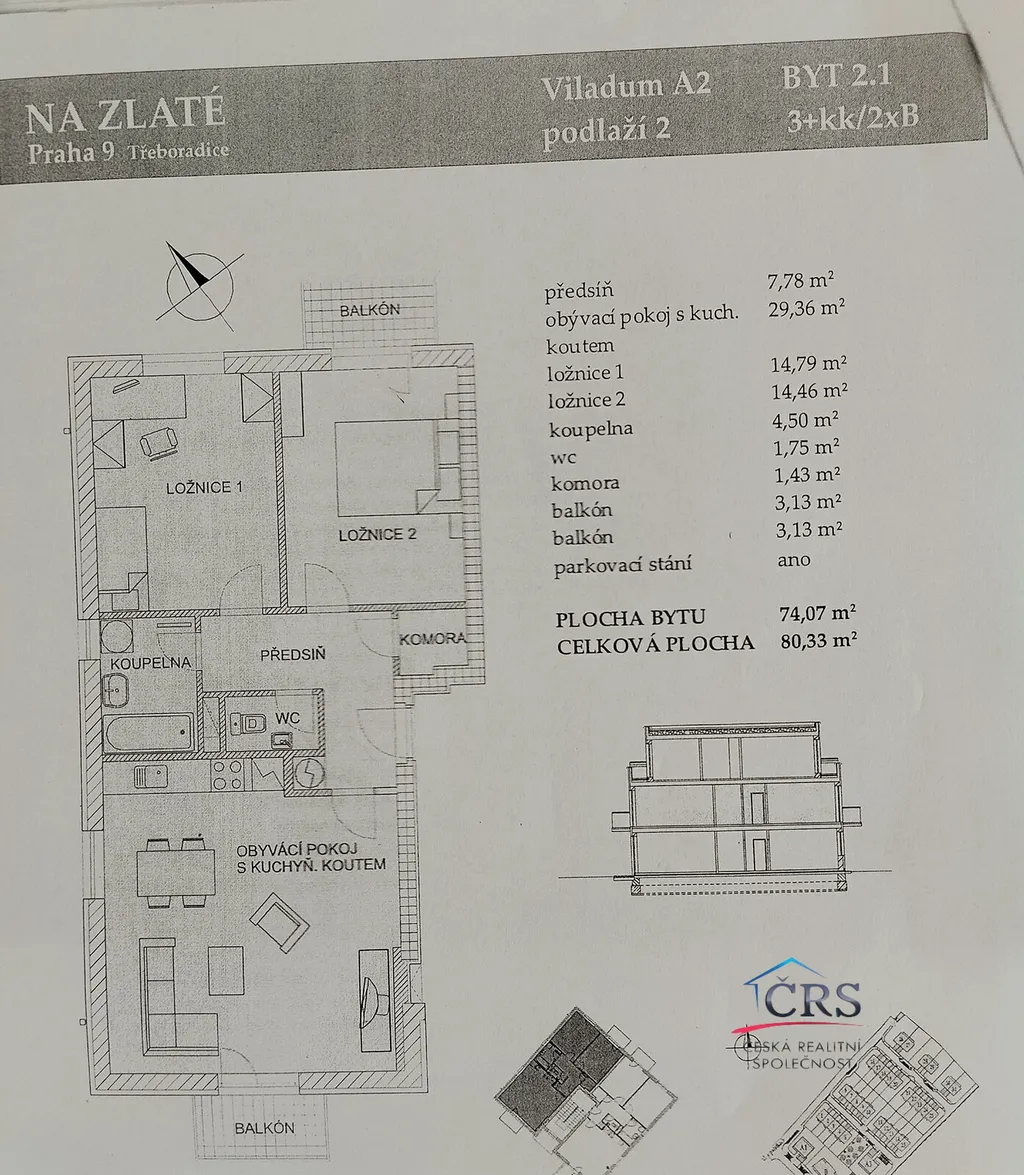 Součástí prodeje bytové jednotky o celkové výměře 80m2 se dvěma balkóny je i vlastní parkovací místo před domem o velikosti 11m2 a zahrada o výměře 95m2.