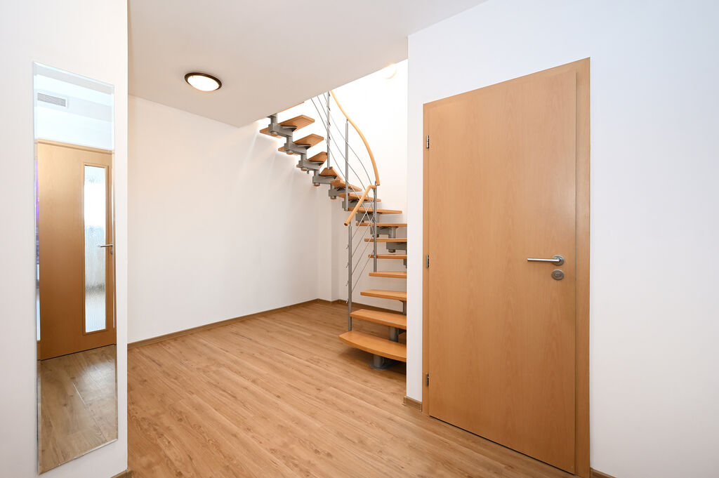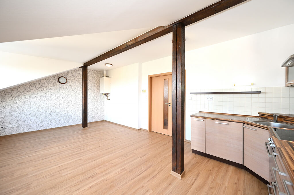 Ve spodním patře se kromě chodby nachází také druhá toaleta s umyvadlem a prostorný obývací pokoj s kuchyňským koutem, který je vybaven novou myčkou nádobí, sklokeramickou varnou deskou, elektrickou troubou a digestoří. Součástí pronájmu není pračka ani lednice. Dalším benefitem je orientace do klidného vnitrobloku, takže se nemusíte obávat hluku z ulice. Ohřev vody i vytápění bytu zajišťuje plynový kotel.