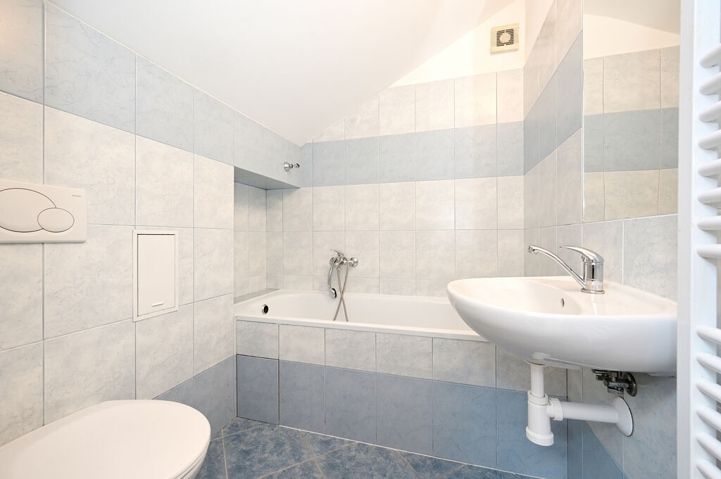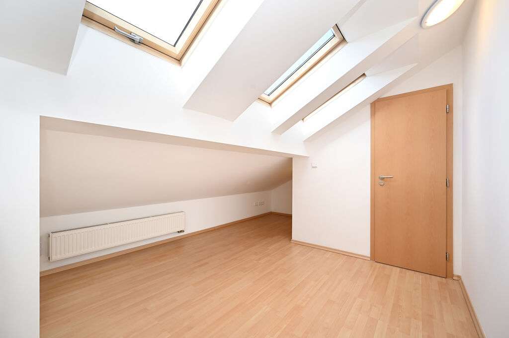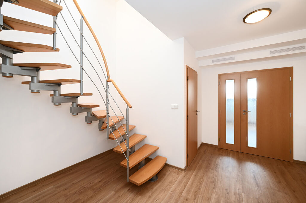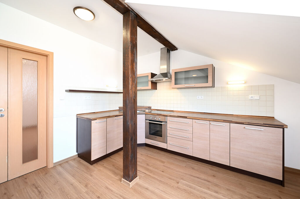 Ve spodním patře se kromě chodby nachází také druhá toaleta s umyvadlem a prostorný obývací pokoj s kuchyňským koutem, který je vybaven novou myčkou nádobí, sklokeramickou varnou deskou, elektrickou troubou a digestoří. Součástí pronájmu není pračka ani lednice. Dalším benefitem je orientace do klidného vnitrobloku, takže se nemusíte obávat hluku z ulice. Ohřev vody i vytápění bytu zajišťuje plynový kotel.
