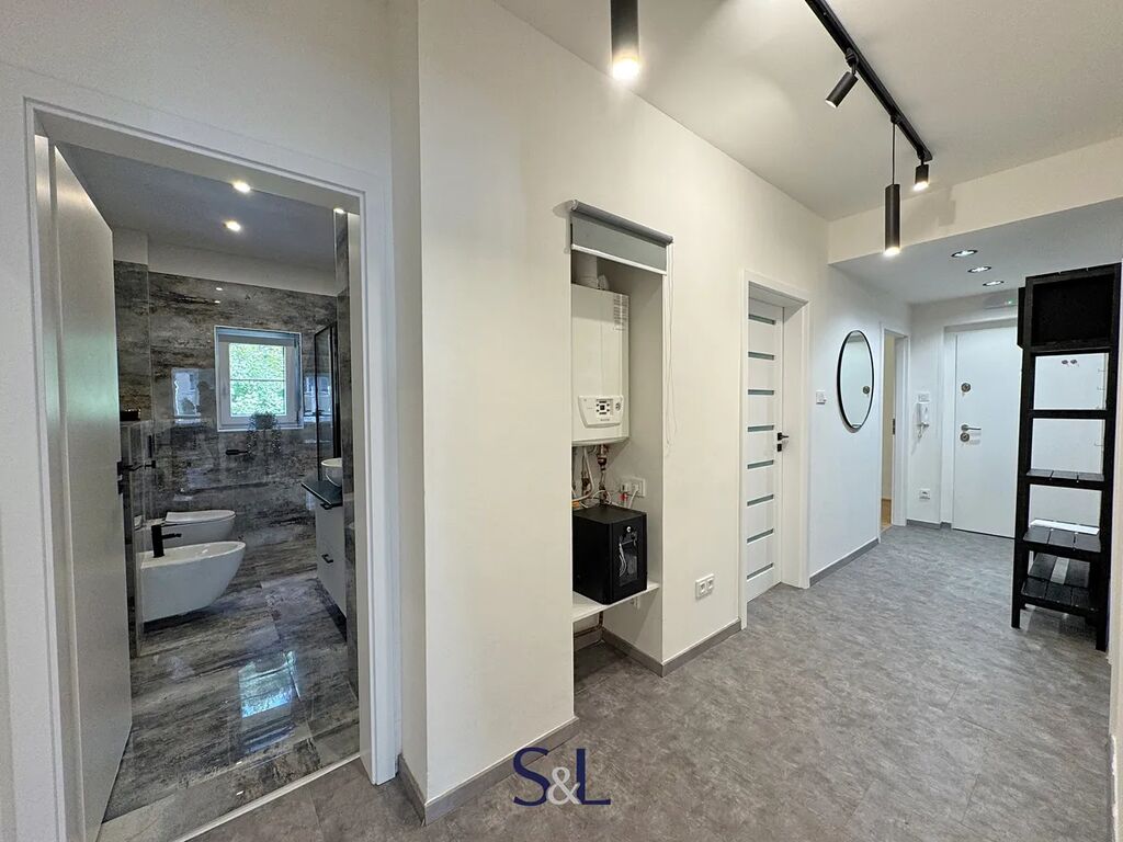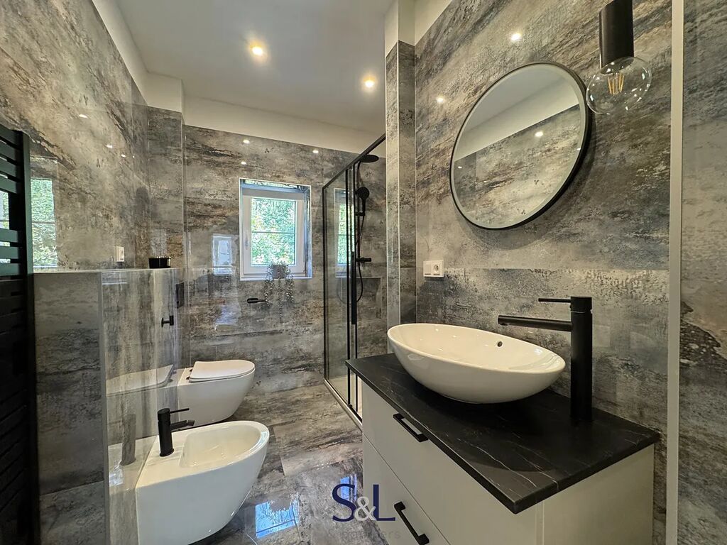 Vybavení zahrnuje pračku, sušičku, myčku (60 cm), americkou lednici, troubu, mikrovlnnou troubu a indukční varnou desku.