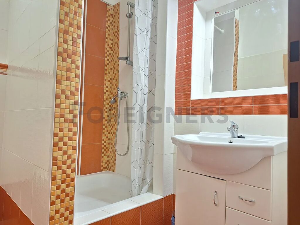 Koupelna se sprchou, pračkou a umyvadlem se zrcadlem; WC je oddělené.