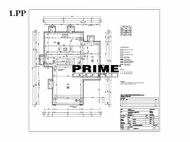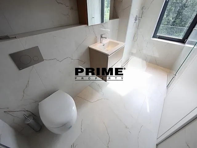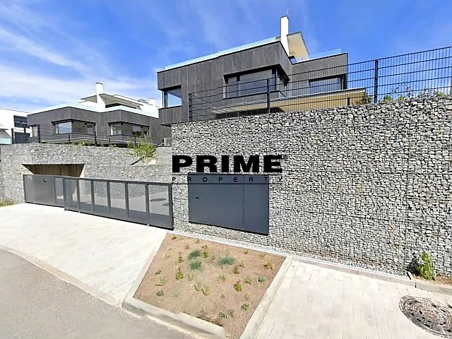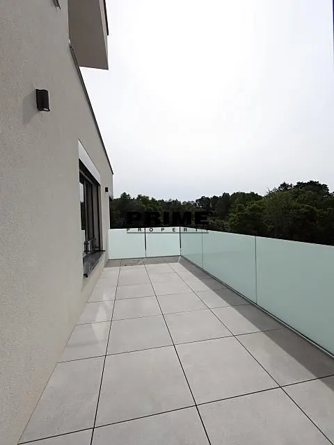 Fotografie interiéru jsou použity z velmi podobného domu. Dispozice přízemí domu: vstupní předsíň, obývací pokoj s krbem, jídelní částí, otevřenou, plně vybavenou kuchyní se spotřebiči a se vstupem na krytou terasu a zahradu, ložnice / pracovna, vybavená šatna a samostatné WC. 1. patro: galerie, hlavní ložnice s vlastní koupelnou (se sprchovým koutem, umyvadlem, toaletou, bidetem a pisoárem), další tři ložnice a koupelna (se sprchovým koutem, vanou, umyvadlem, toaletou a bidetem). 2. patro: prostorná místnost s přístupem na velkou terasu a koupelna (se sprchovým koutem, umyvadlem a toaletou). V suterénu domu jsou 2 velké místnosti (sklad, posilovna apod.), místnost se sprchovým koutem, technická místnost se servrovnou a výlevkou a dvougaráž.