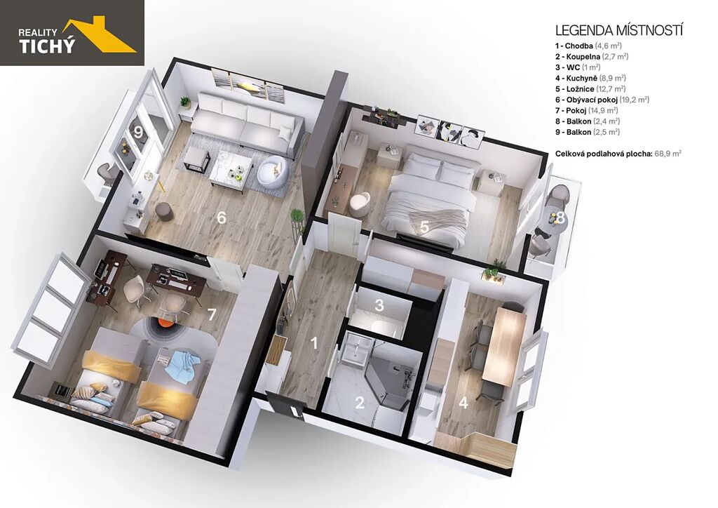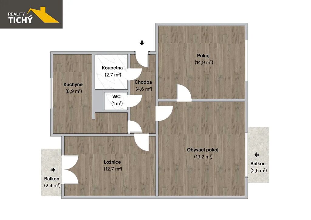 • velikost celkem 69 m2 – z toho 64 m2 byt a 5 m2 dva balkony (2,5 m2 + 2,5 m2)