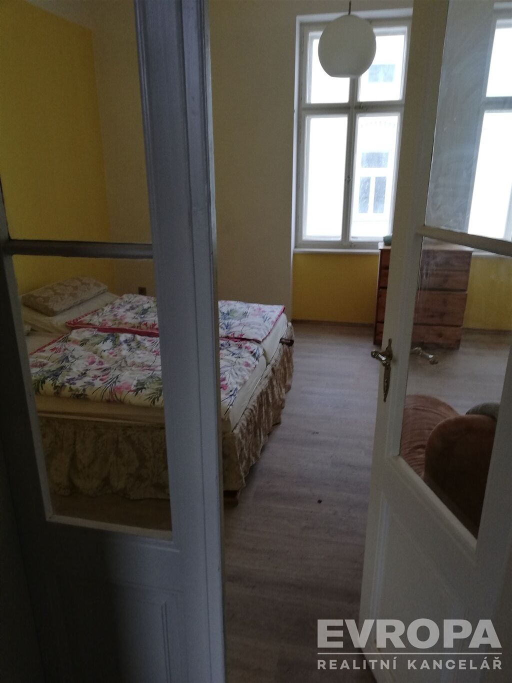 Do pokoje vedou dvoukřídlé prosklené secesní dveře, v pokoji jsou dvě okna do Husovy ulice, manželská postel možno s povlečením, sedačka, skříňka. Na podlahách je kvalitní vinylová podlaha. V každé místnosti je dostatek zásuvek, aby se nepoužívala žádná prodlužovačka.