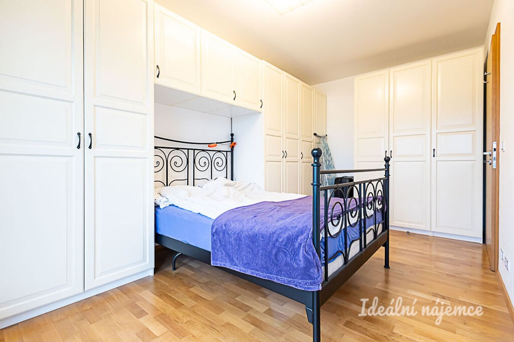 Ložnice je zařízena manželskou postelí a praktickými úložnými prostory.