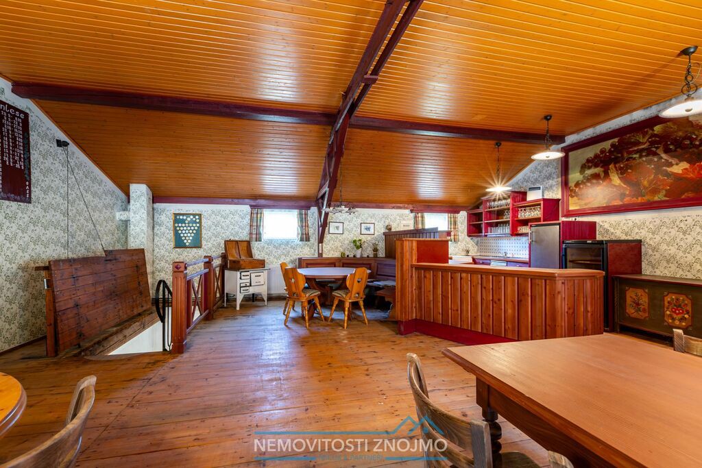 - Im Obergeschoss befindet sich eine Bar mit Sitzgelegenheiten (Restauranttyp) insgesamt zwei Räume mit Tischen, Stühlen und Kamin