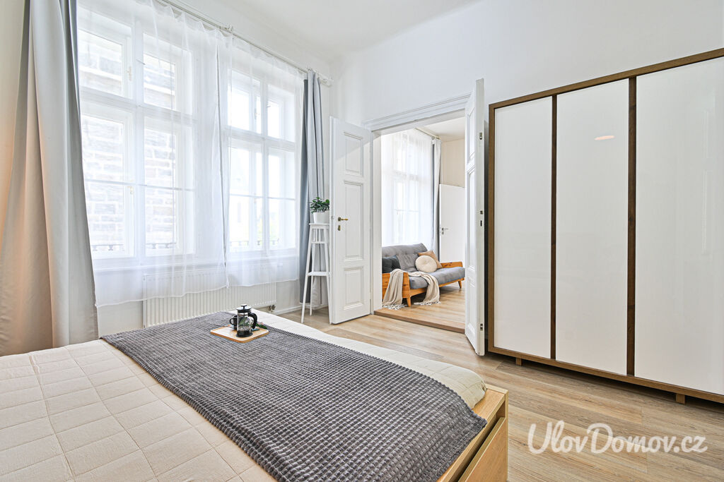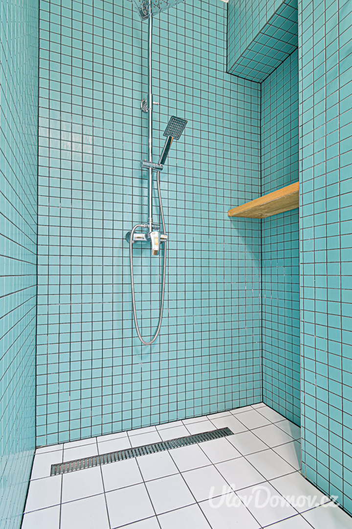 Vstup do bytu vede z historické pavlače s krásným výhledem na vodárenskou věž a řeku Vltavu.
